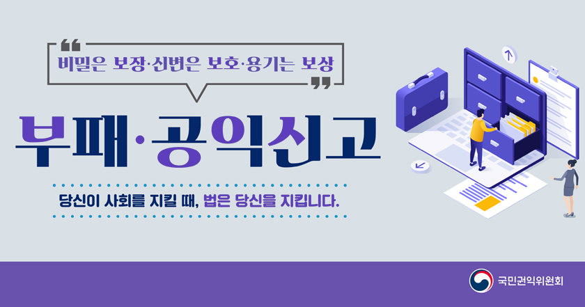 『부패방지 및 국민권익위원회의 설치와 운영에 관한 법률』및 같은 법 시행령에 따라 신고자의 인적사항은 철저히 보호됩니다.