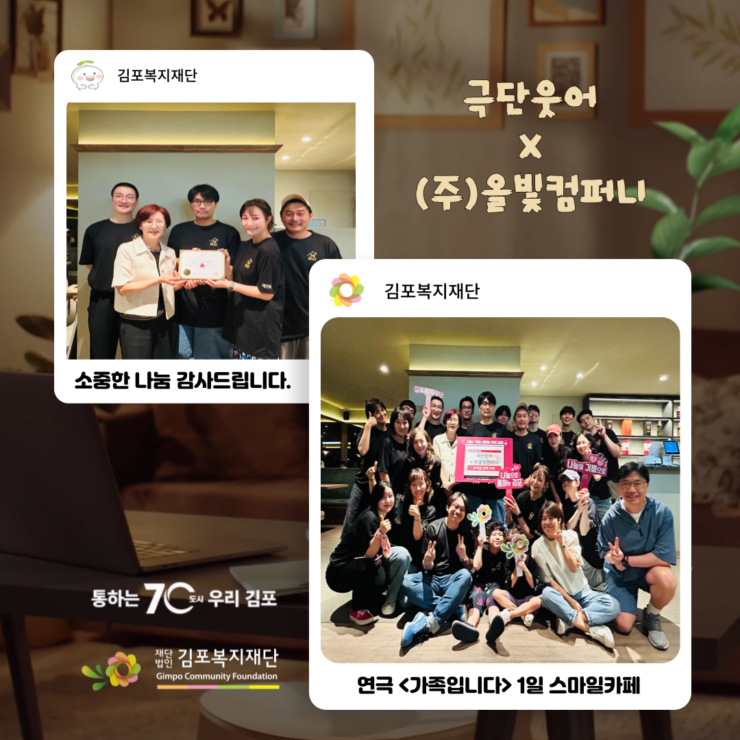 극단웃어와 ㈜올빛컴퍼니에서 연극 <가족입니다> 10주년을 기념하기 위해 1일 스마일카페를 열고, 운영 수익금 전액을 김포복지재단에 기탁해주셨습니다.