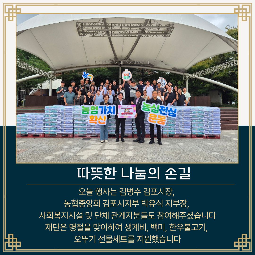 9월 24일 진행한 행사에는 김병수 김포시장, 농협중앙회 김포시지부 박유식지부장, 사회복지시설 및 단체 관계자분들도 참석하여 자리를 빛내주셨습니다.