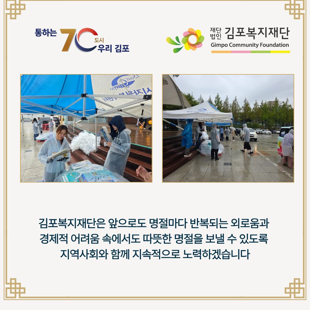 재단은 명절이 맞이하여 김포시 내 어려운 이웃들에게 생계비, 백미, 한우불고기, 오뚜기 선물세트 등을 지원했습니다.