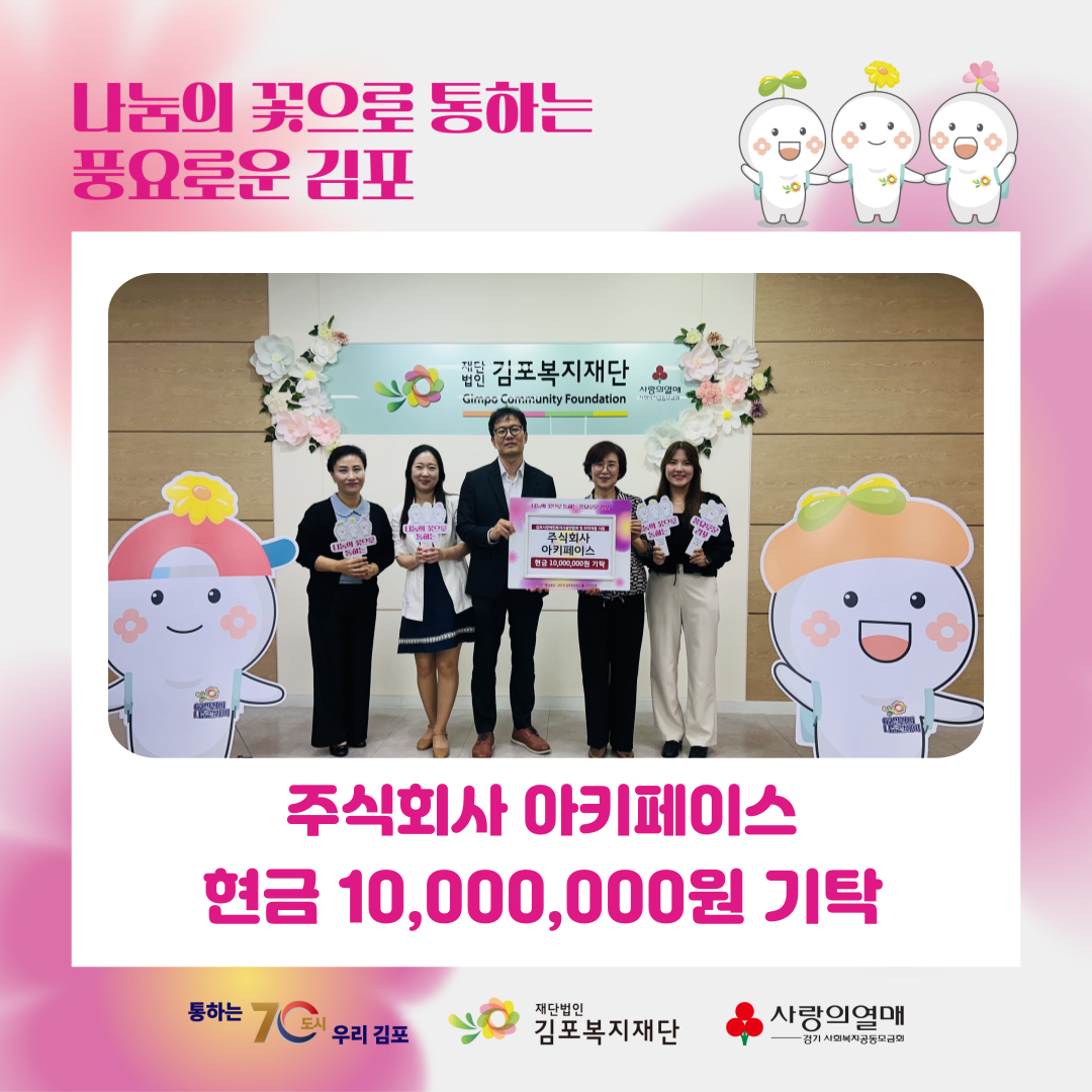 김포시 대곶면에 위치한 (주)아키페이스에서 김포시장애인시설연합회 및 지역 내 도움이 필요한 이웃들을 위하여 현금 10,000,000원을 기탁해주셨습니다.