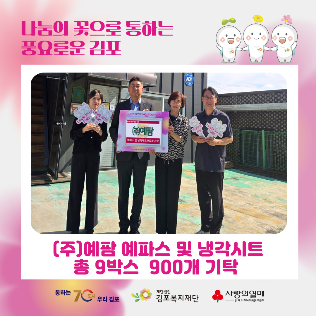 9월 25일(목), ㈜예팜에서 지역 내 소외계층을 위해 예파스와 냉각시트 총 900개를 기탁해 주셨습니다.