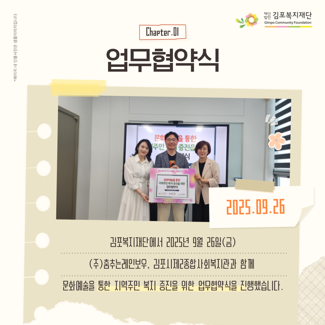 문화예술을 통한 지역주민 복지 증진을 위한 업무협약식(춤추는레인보우, 김포시제2종합사회복지관)