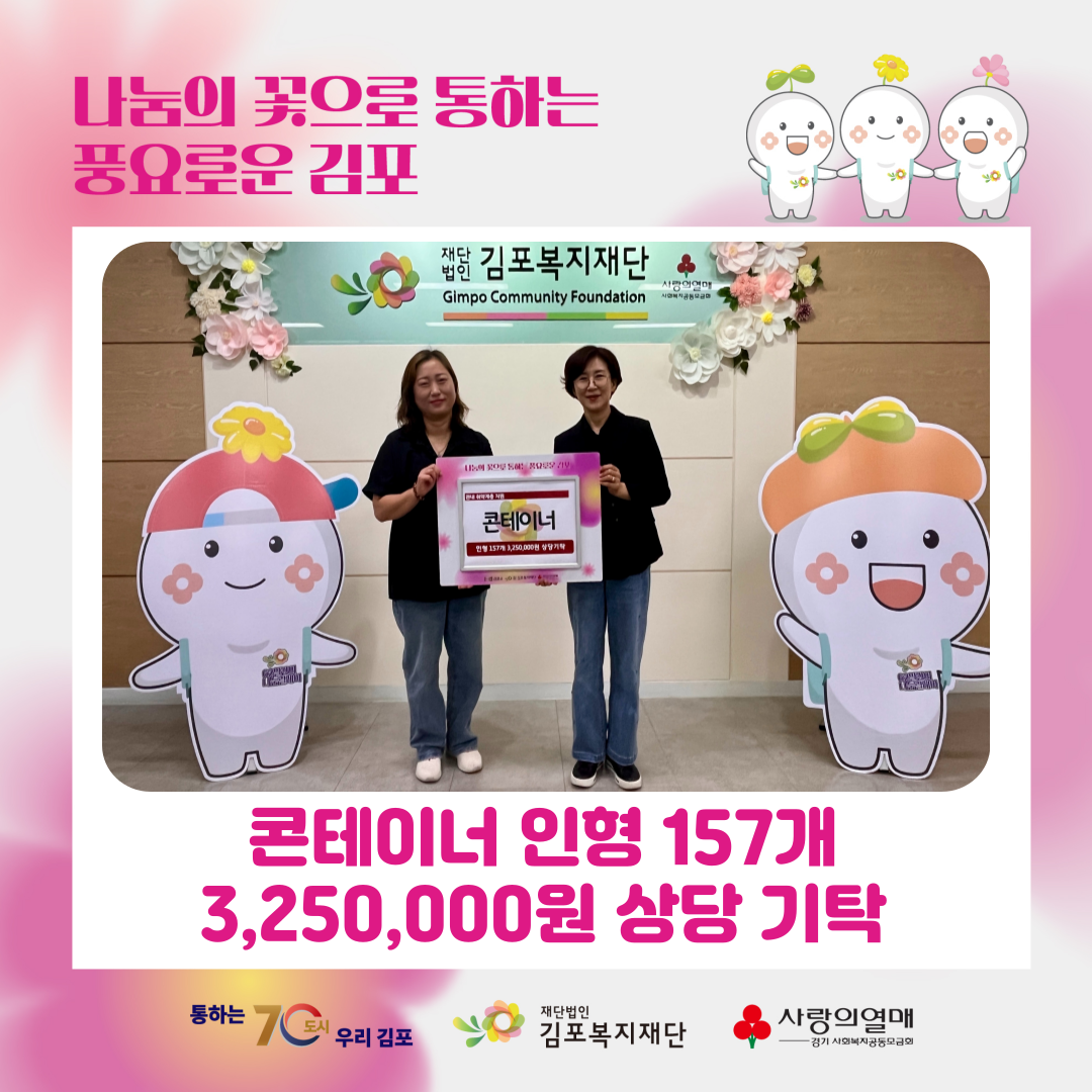 10월 14일 김포시에 위치한 콘테이너에서 귀여운 인형 157개 3,250,000원 상당를 김포복지재단에 기탁했습니다.