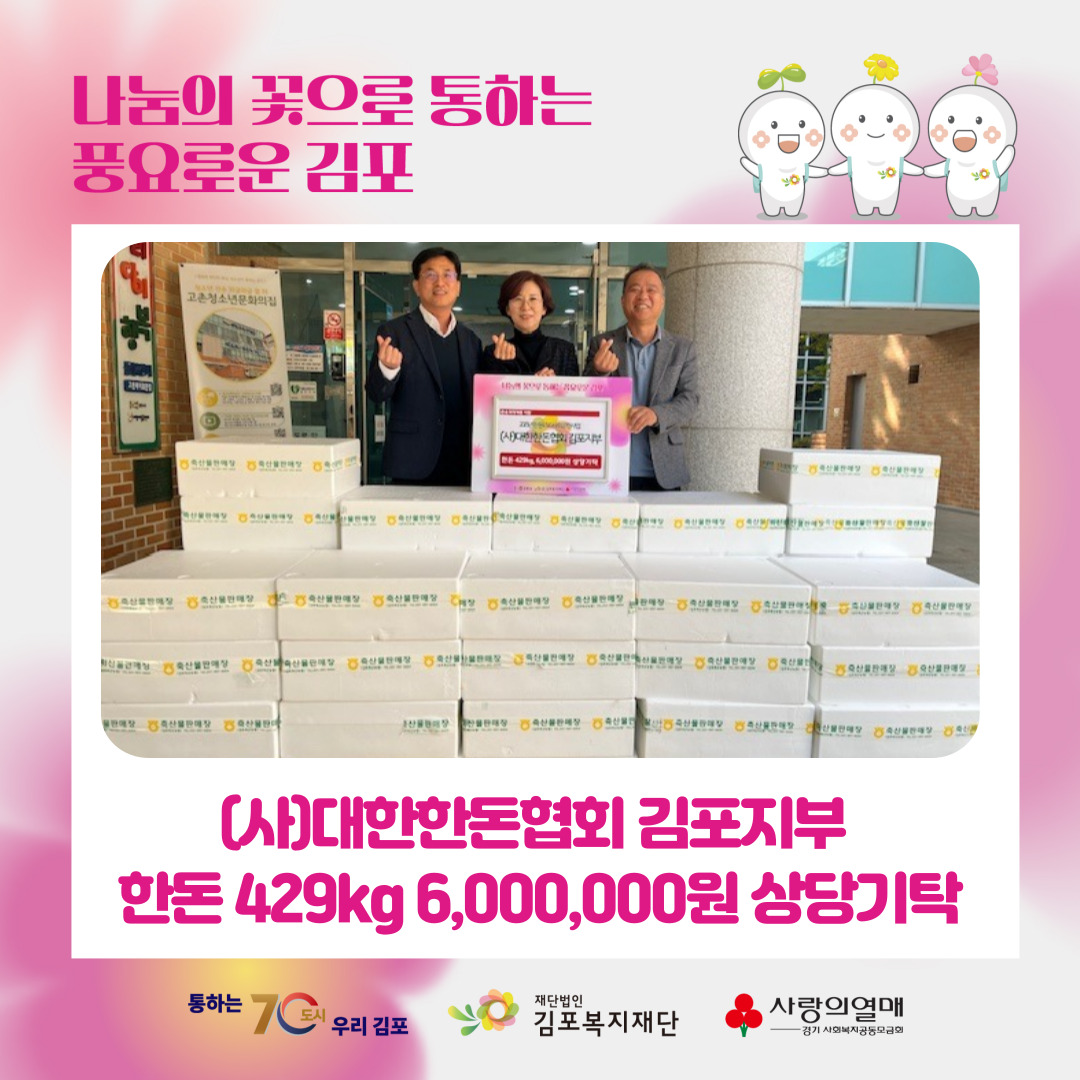 국산 한돈 429kg(6,000,000원 상당)**을 김포복지재단에 기탁해주셨습니다.