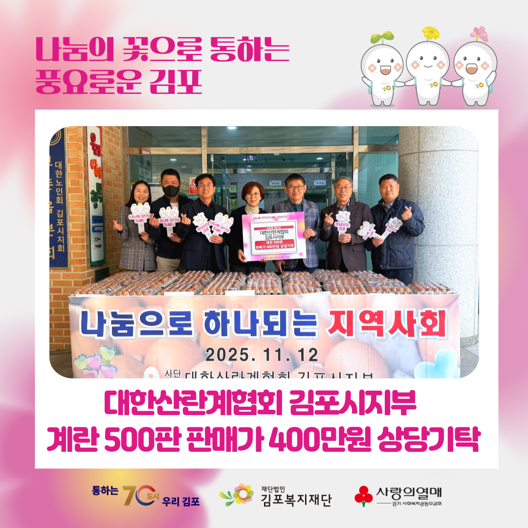 2025년 11월 12일(수) 대한산란계협회 김포시지부에서 건강에 좋고 맛도 좋은 신선한 계란 500판 400만원 상당을 기탁해주셨습니다.