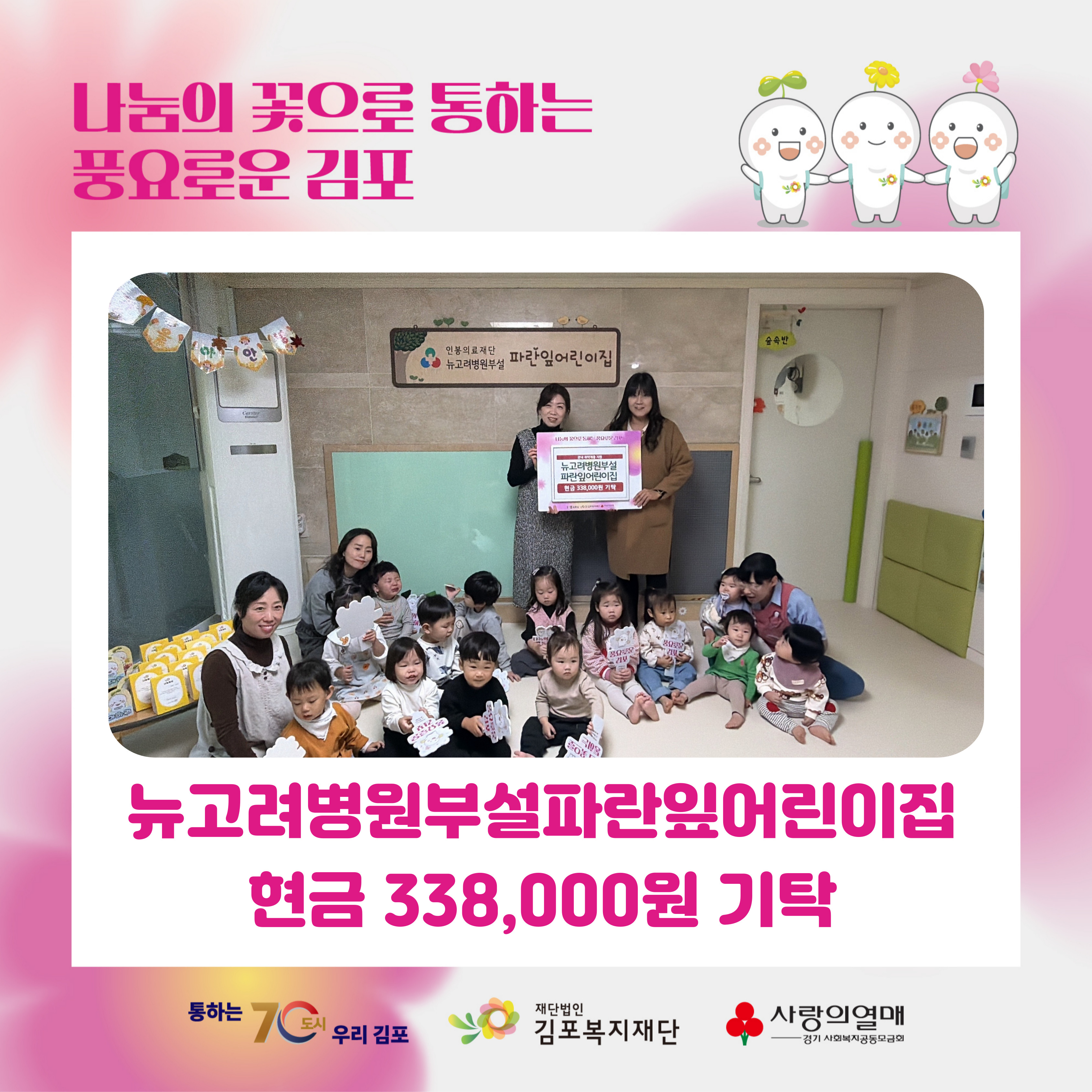 2025년 11월 18일(화) 장기동에 위치한 뉴고려병원부설파란잎어린이집에서 지역 내 취약계층을 위해서 모은 현금338,000원을 기탁해주셨습니다.