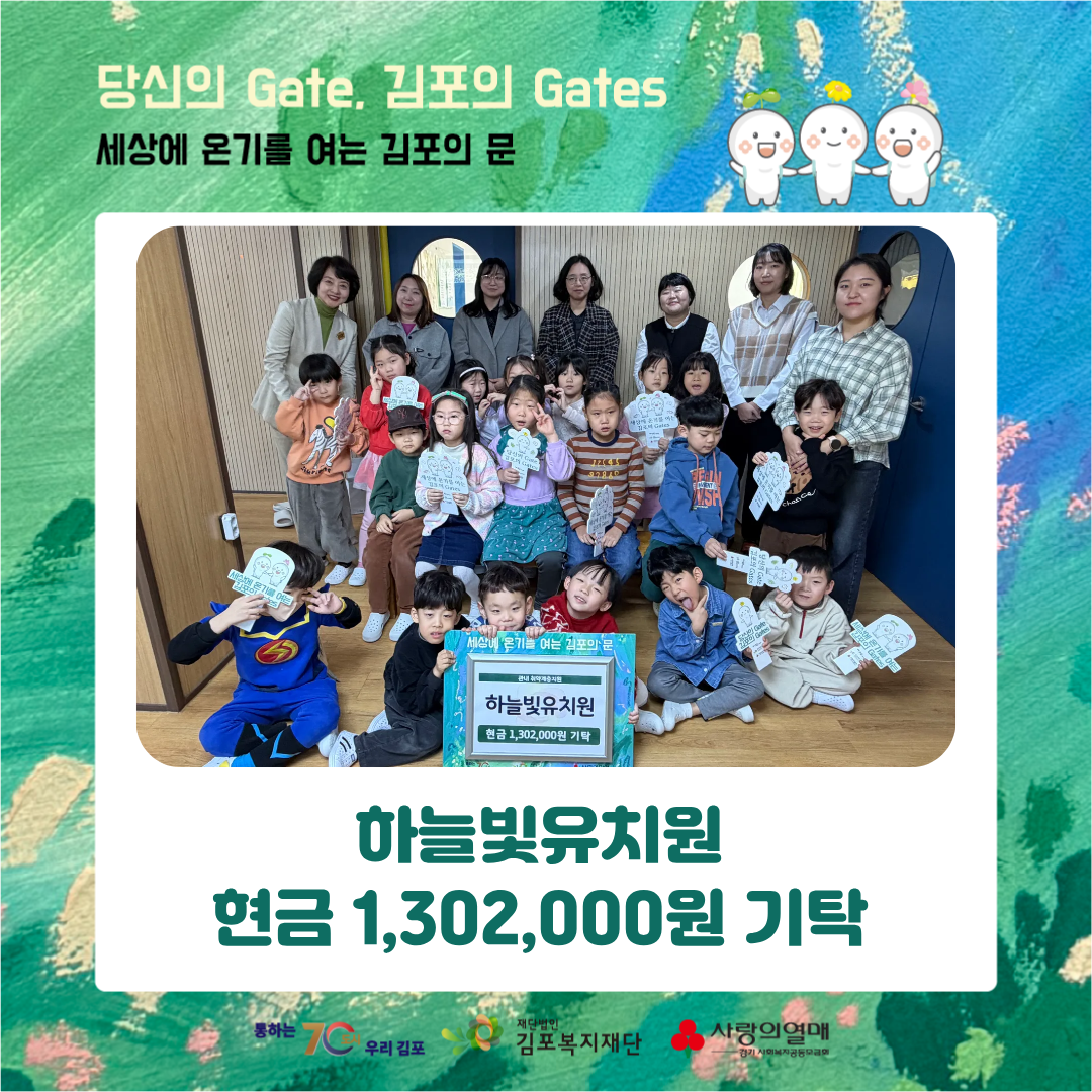풍무동에 위치한 하늘빛유치원에서 2025년 12월 17일, 김포복지재단에 현금 1,302,000원을 기탁하며 따뜻한 나눔을 실천하였습니다.