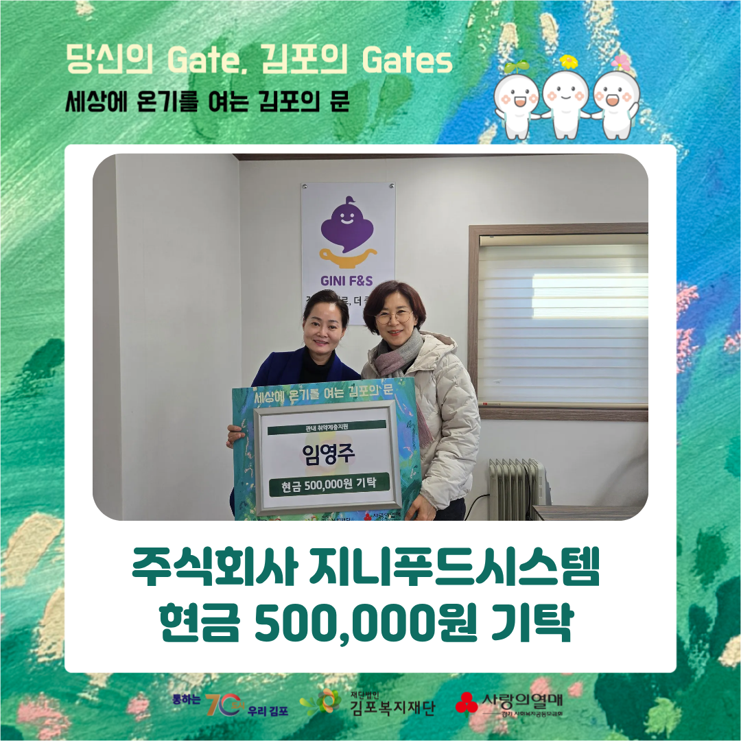 2025년 12월 18일, 주식회사 지니푸드시스템 임영주 대표가 김포복지재단에 현금 500,000원을 기탁하며 지역사회 나눔에 따뜻한 마음을 전했습니다.