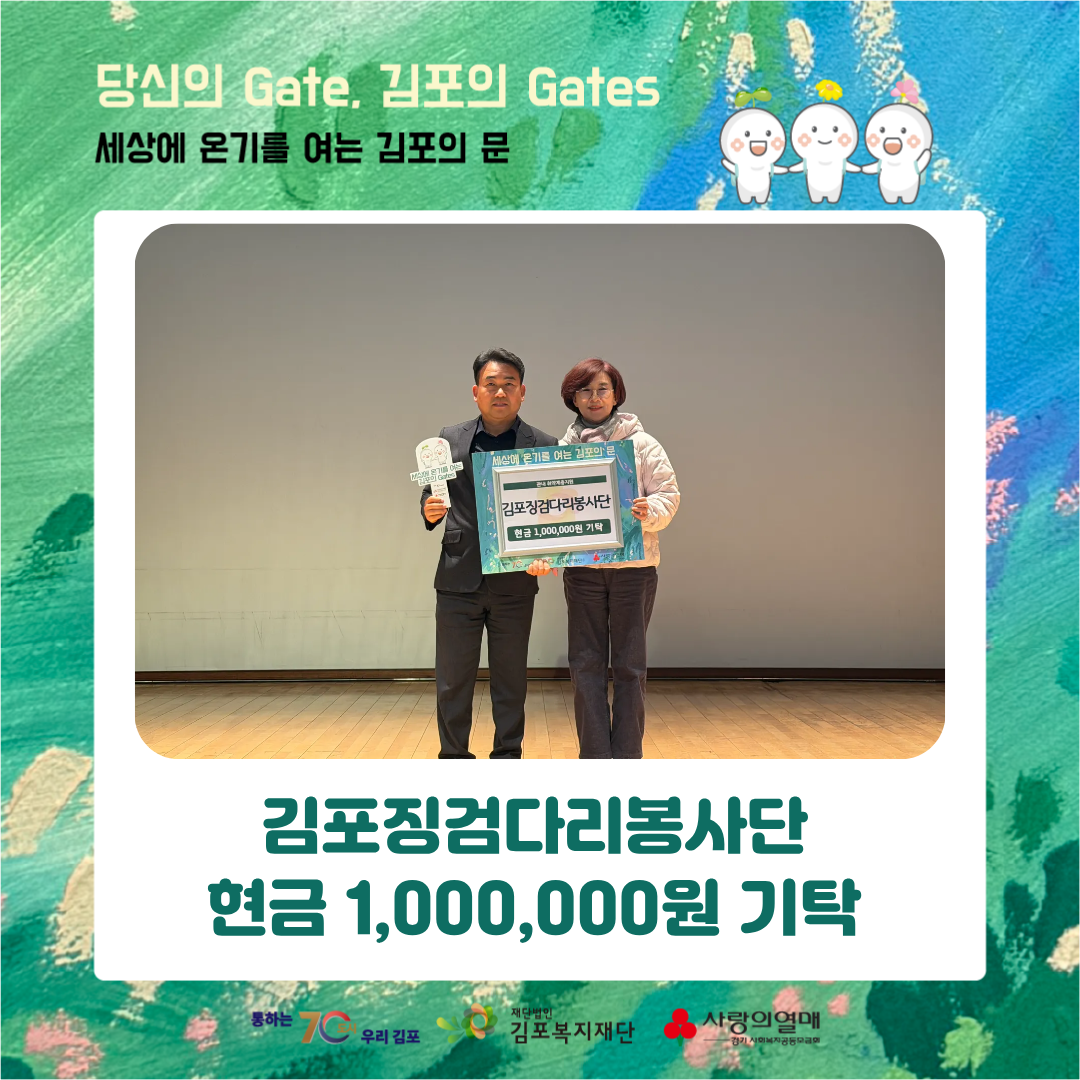 2025년 12월 19일 김포징검다리봉사단은 지역 인재 육성과 교육 나눔 실천을 위해 김포복지재단에 현금1,000,000원을 기탁해 주셨습니다.