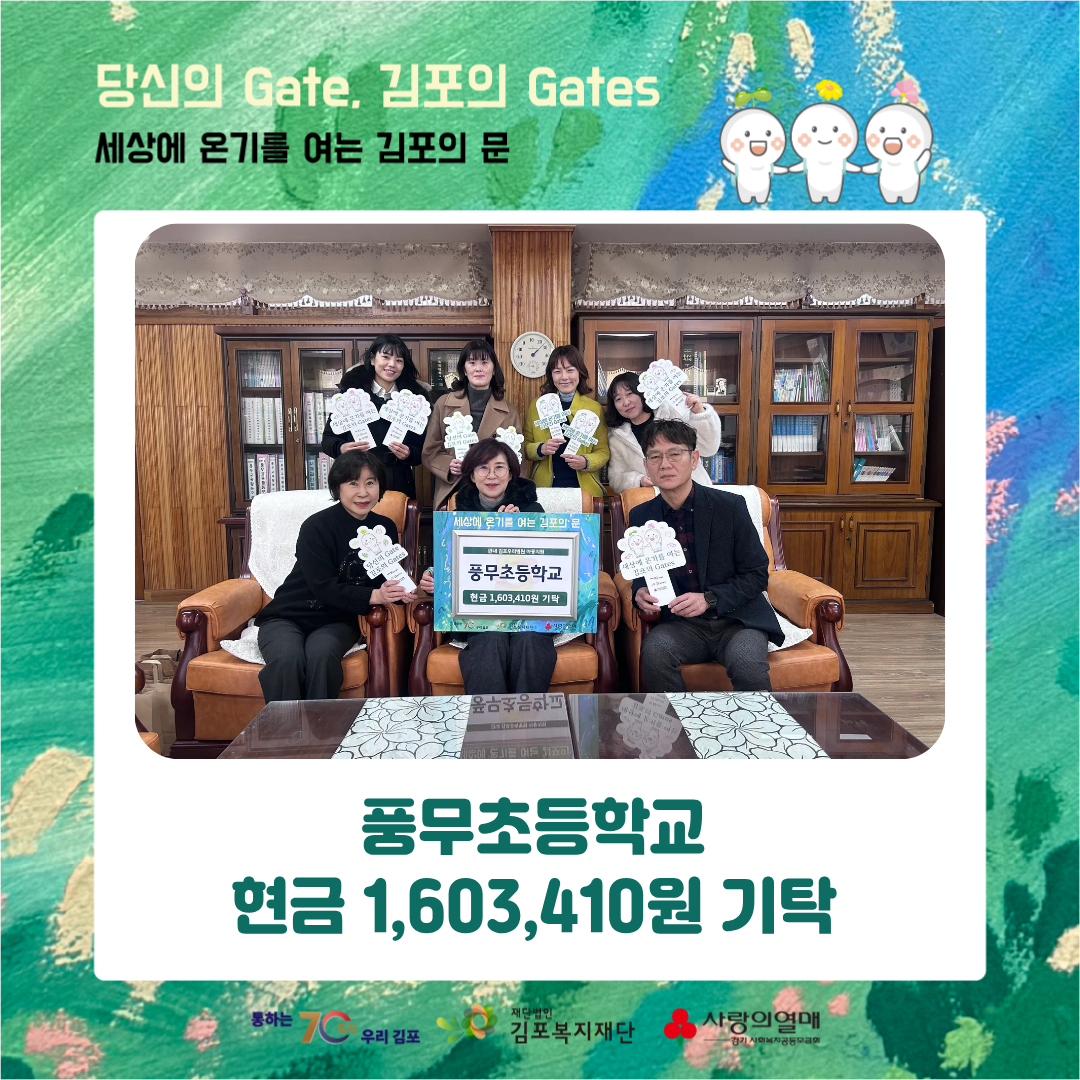 기탁된 성금은 김포 지역 내 도움이 필요한 이웃을 위해 소중히 사용될 예정입니다. 지역사회와 함께 성장하는 학교, 나눔을 일상으로 실천하는 풍무초등학교의 따뜻한 행보에 깊은 감사의 마음을 전합니다.
