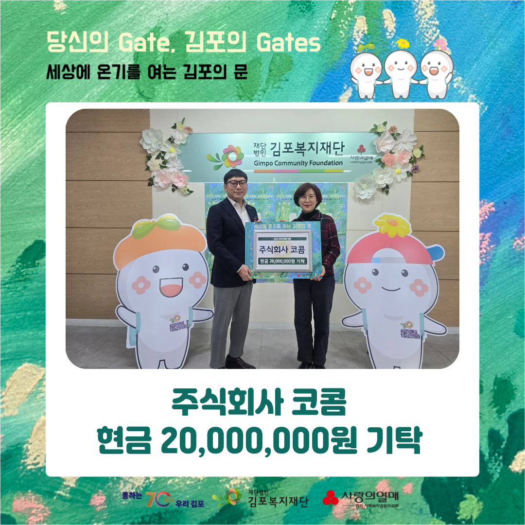 김포복지재단은 지속적으로 나눔을 실천해주신 주식회사 코콤에 깊이 감사드리며, 기탁해주신 성금이 필요한 곳에 투명하고 의미 있게 전달될 수 있도록 최선을 다하겠습니다.