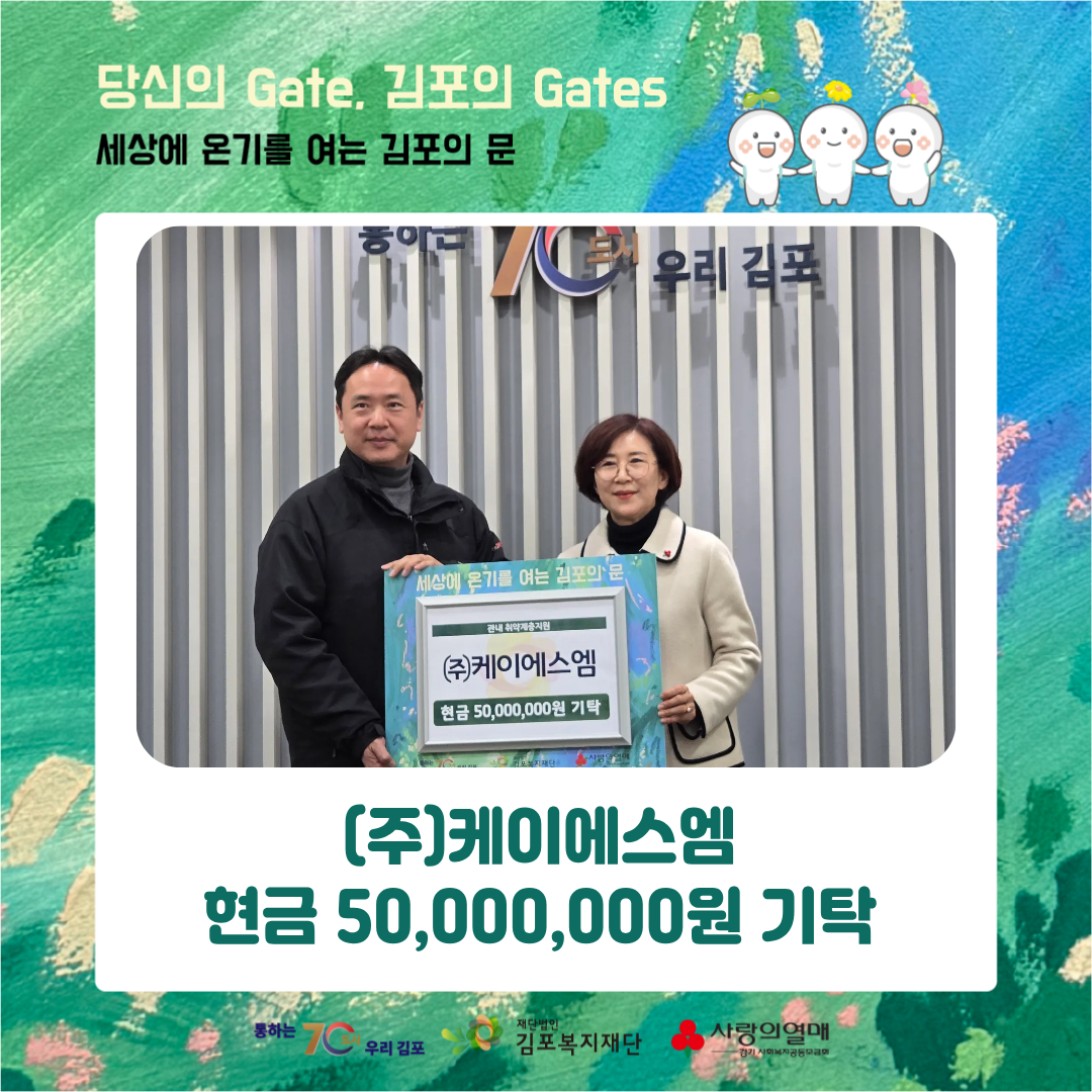 어려운 이웃을 먼저 생각해주신 ㈜케이에스엠의 따뜻한 선한 영향력에 진심으로 감사드리며, 김포복지재단은 이 마음이 시민들의 삶에 희망으로 이어지도록 한 걸음 한 걸음 책임 있게 실천해 나가겠습니다.