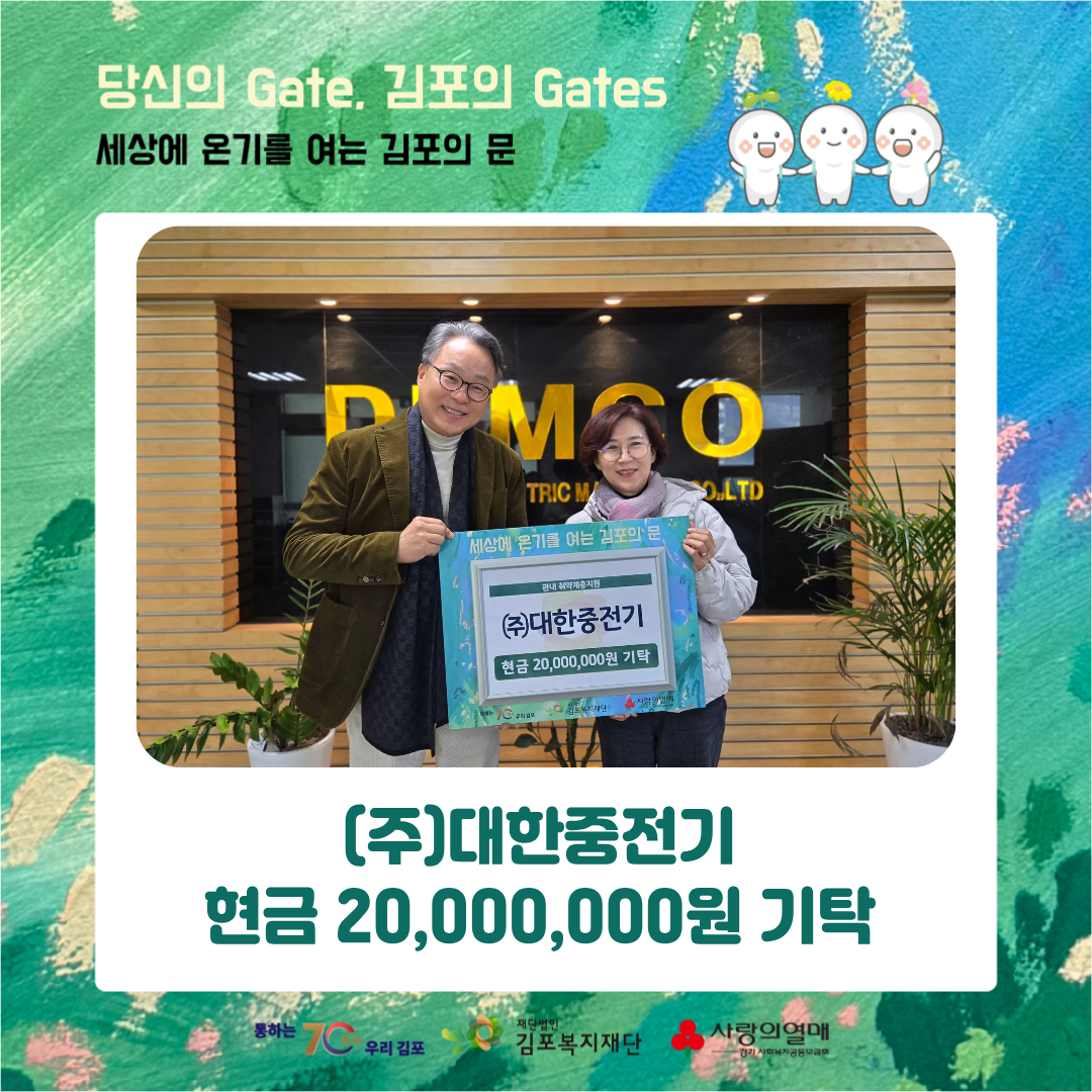 김포시 대곶면에 위치한 ㈜대한중전기에서 12월 31일, 지역사회 나눔 실천을 위해 김포복지재단에 현금 20,000,000원을 기탁했습니다.