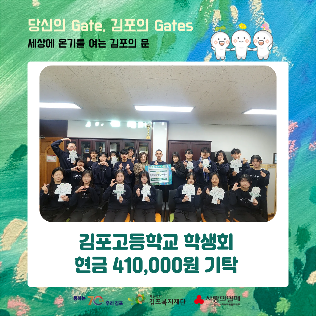 따뜻한 마음을 모아 나눔을 실천해주신 김포고등학교 학생회 여러분께 진심으로 감사드리며, 앞으로도 학생들의 빛나는 도전과 따뜻한 활동을 응원하겠습니다.