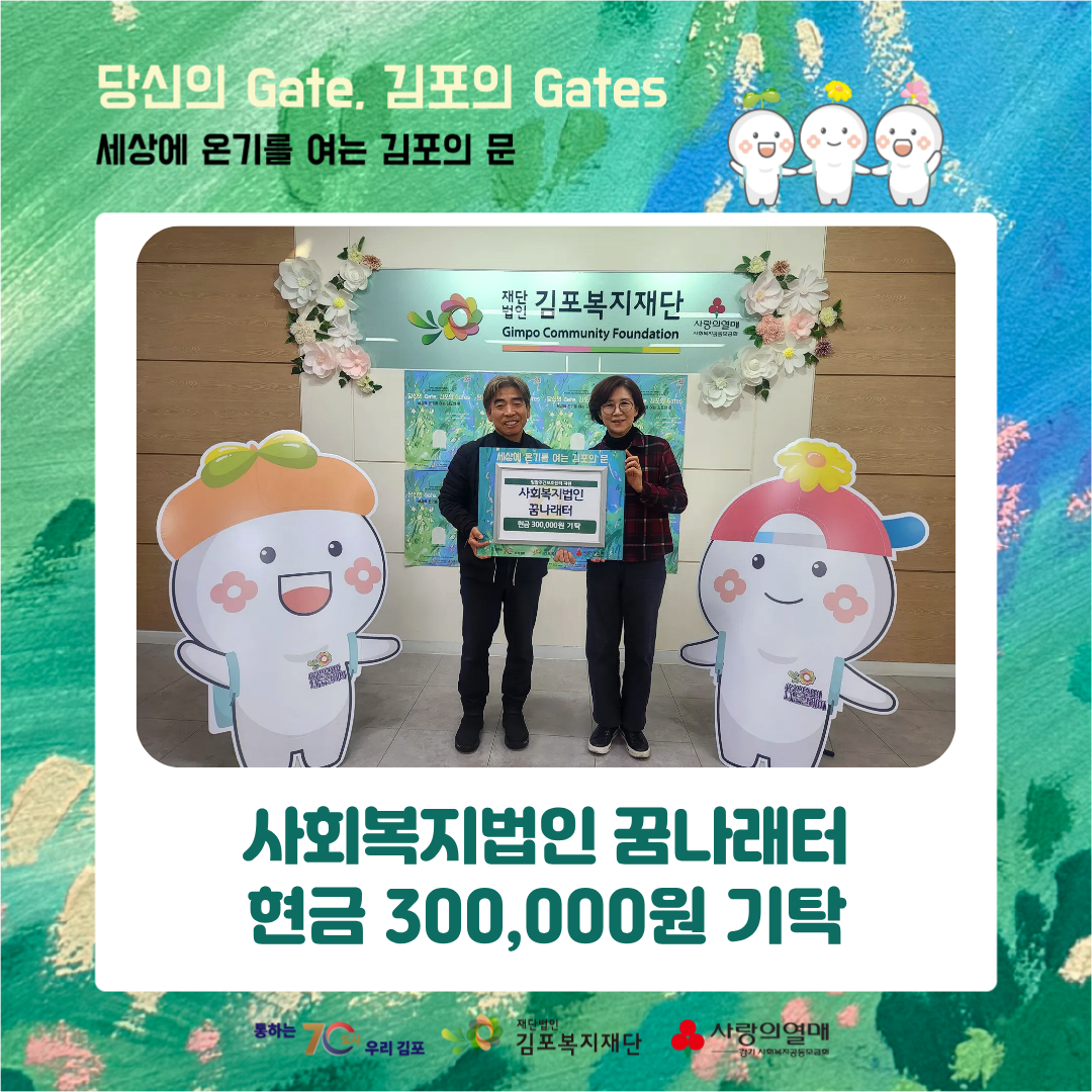 김포복지재단은 나눔으로 함께해 주신 사회복지법인 꿈나래터에 깊은 감사의 마음을 전하며, 앞으로도 지역사회 복지 향상과 사회안전망 강화를 위해 최선을 다하겠습니다.