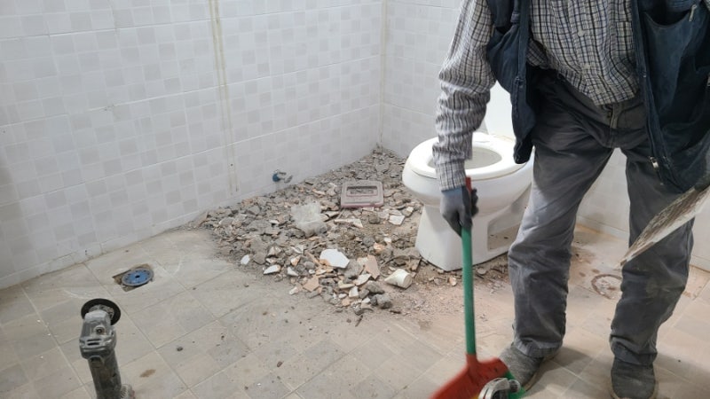 남자 화장실 변기를 1개에서 3개로 증설하는 작업을 하기 위하여 기존 변기를 뜯어내고 새로운 변기를 설치하는 작업을 하고 있습니다.