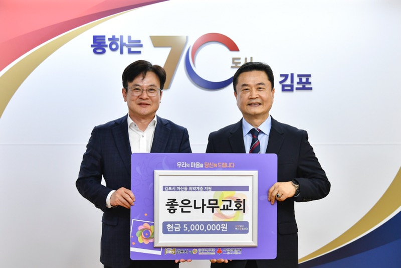 김포 마산동에 위치한 좋은나무교회(담임목사 이성현)에서 마산동 취약계층 지원을 위해 기부금 500만원을 전달하며 지역나눔을 실천 해 주셨습니다.