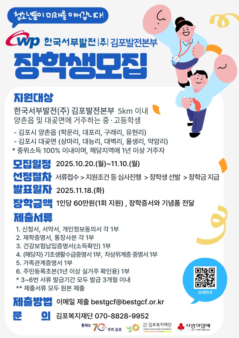 한국서부발전(주)김포발전본부와 함께하는 양촌읍·대곶면 중·고등학생 장학금 지원사업 안내