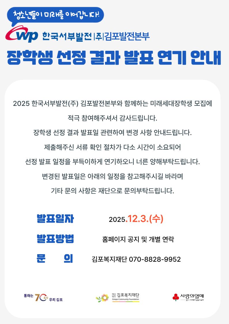 2025 한국서부발전(주) 김포발전본부와 함께하는 미래세대장학생 선정 결과 발표 연기 안내